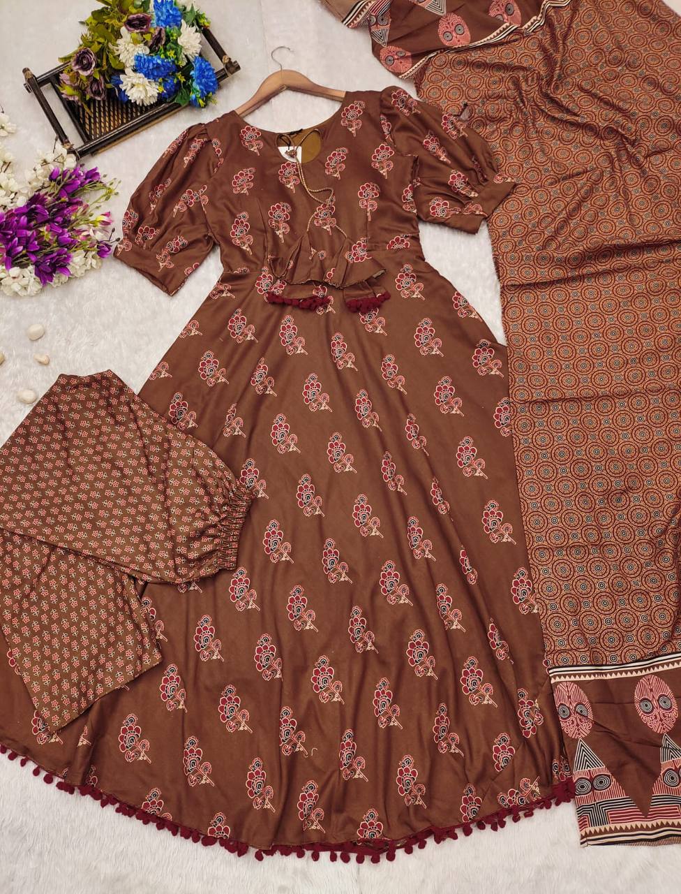 | Unveiling our exquisite suit set in Muslin fabric, featuring stunning Aj-rakh prints and paired with a luxurious dupptta. Perfect for any occasion, this ensemble promises comfort and elegance |