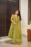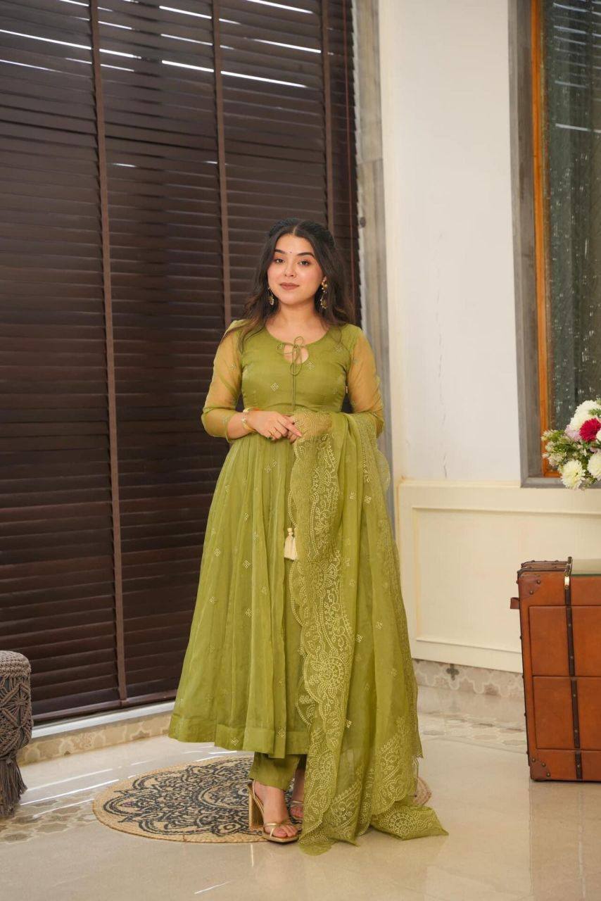 | Introducing our green organza suit set with intricate embroidery, perfect for the upcoming festivities. This elegant piece combines traditional craftsmanship with modern elegance, making it ideal for celebrating in style. |