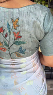 Saree- 3D printed saree with a touch of ivory work & tussels in pallu.