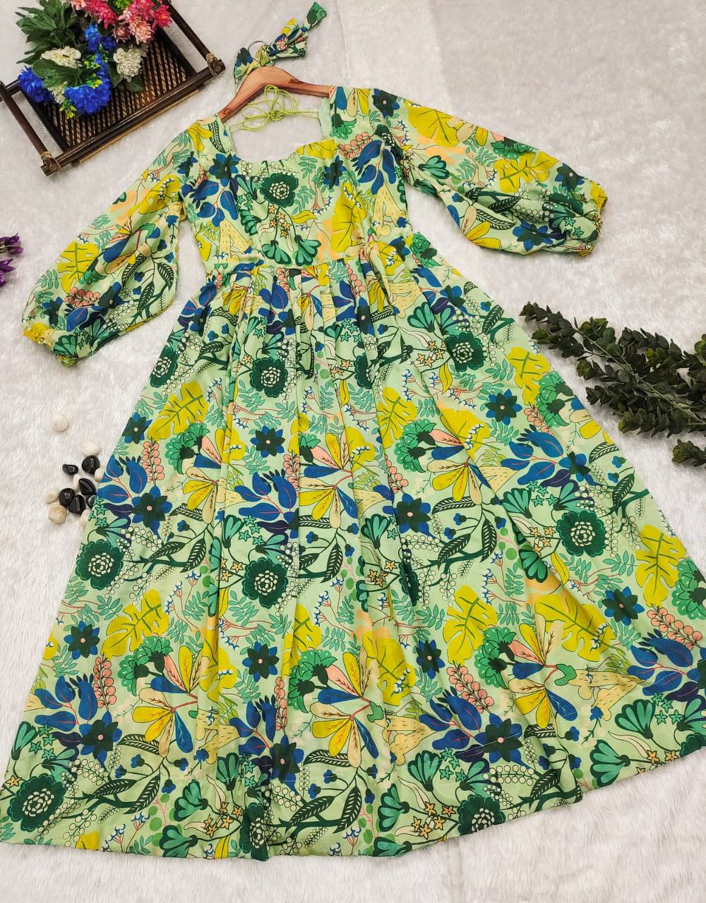 | Our latest: a chic chinon fabric maxi with trendy sleeves, perfect for summer. Chinon’s softness and breathability make it ideal, offering comfort and elegant style for the season. |