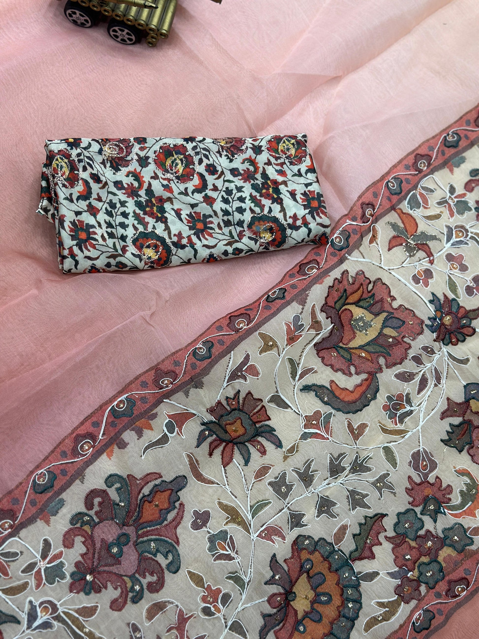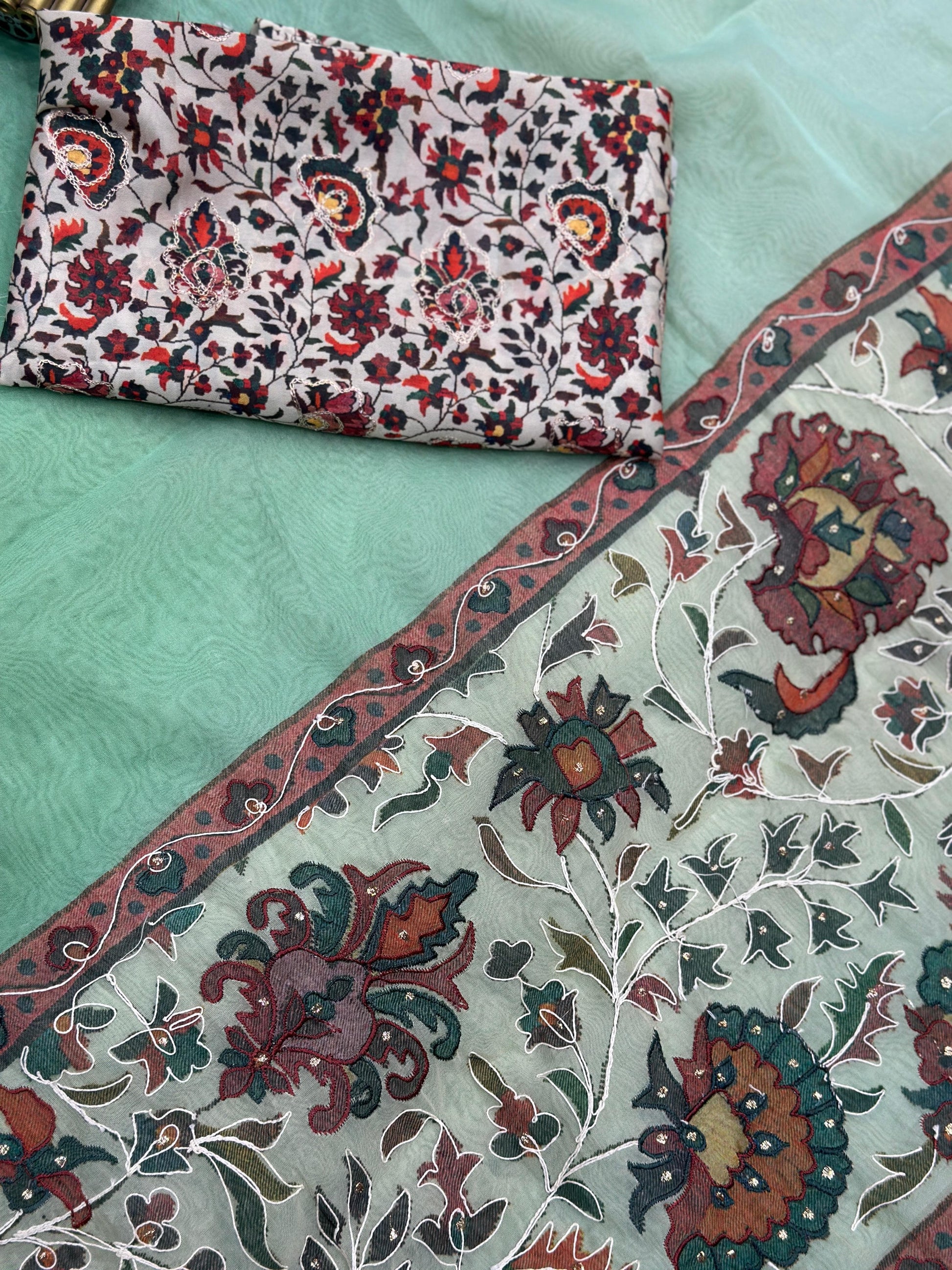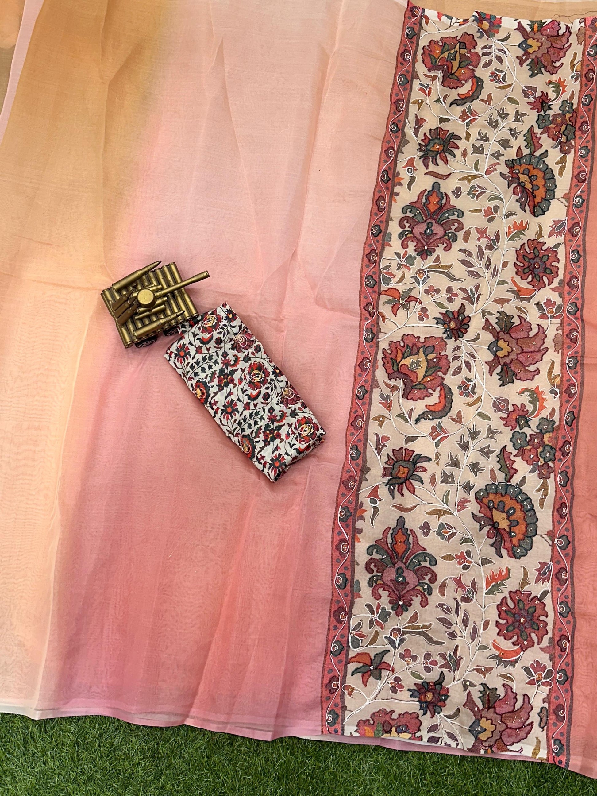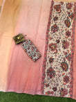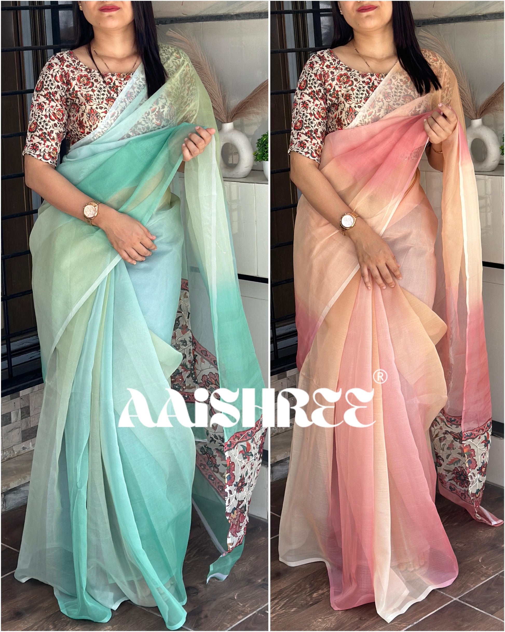 Saree- shades printed saree with ajrakh printed pallu & hand pitha work in pallu